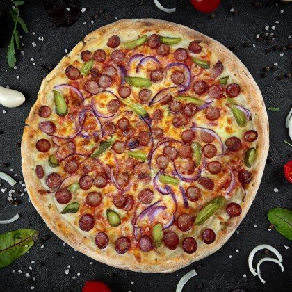 Краковская колбаса, пеперони, шампиньоны, маслины, моцарелла, томатный соус