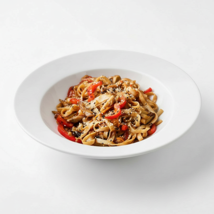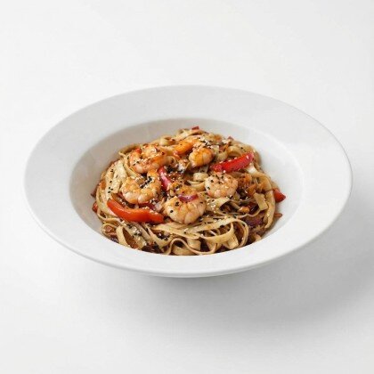 Пшеничная лапша, овощной микс, креветки, фирменный соус, кунжут