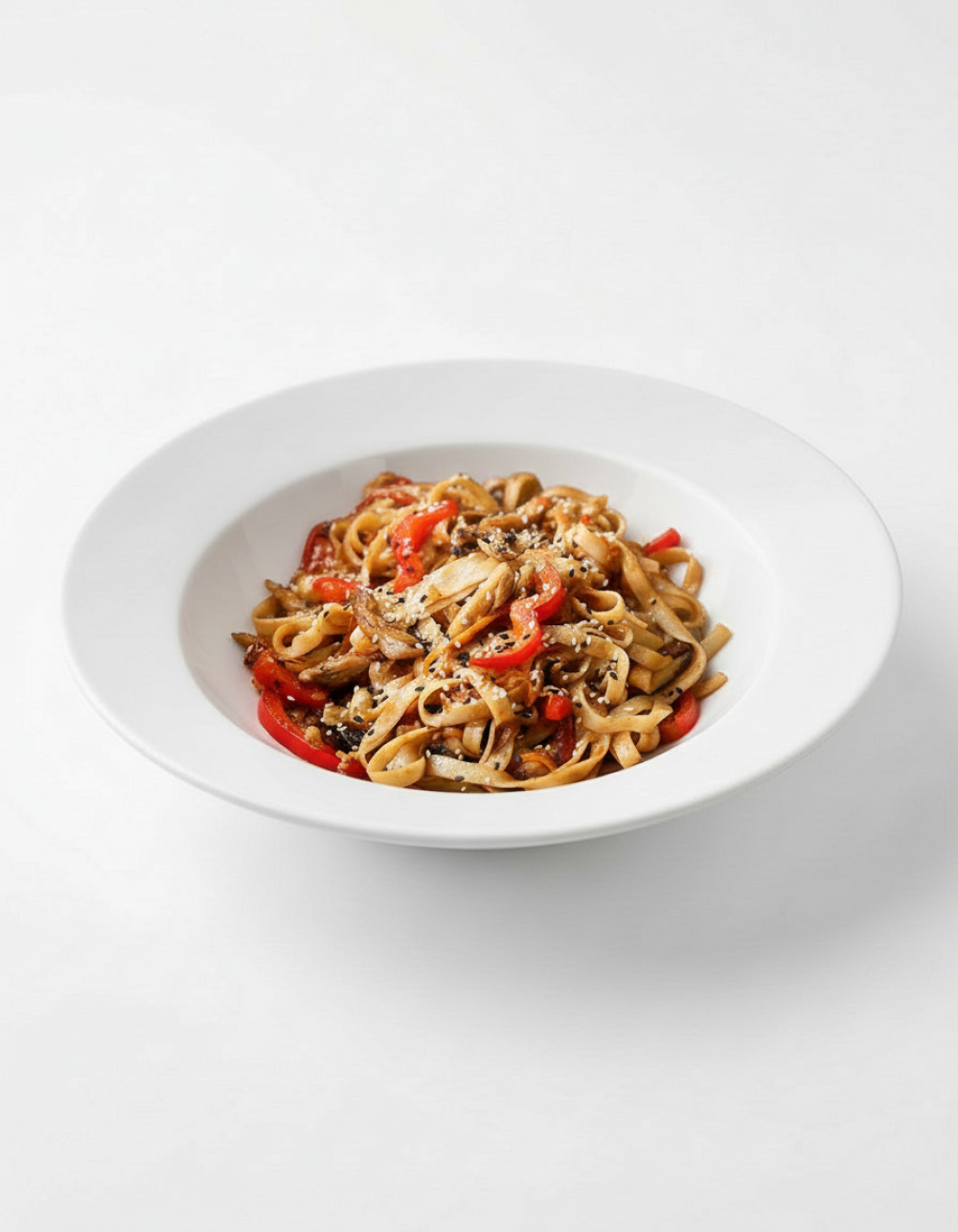 Пшеничная лапша, овощной микс, шампиньоны, курица, фирменный соус, кунжут