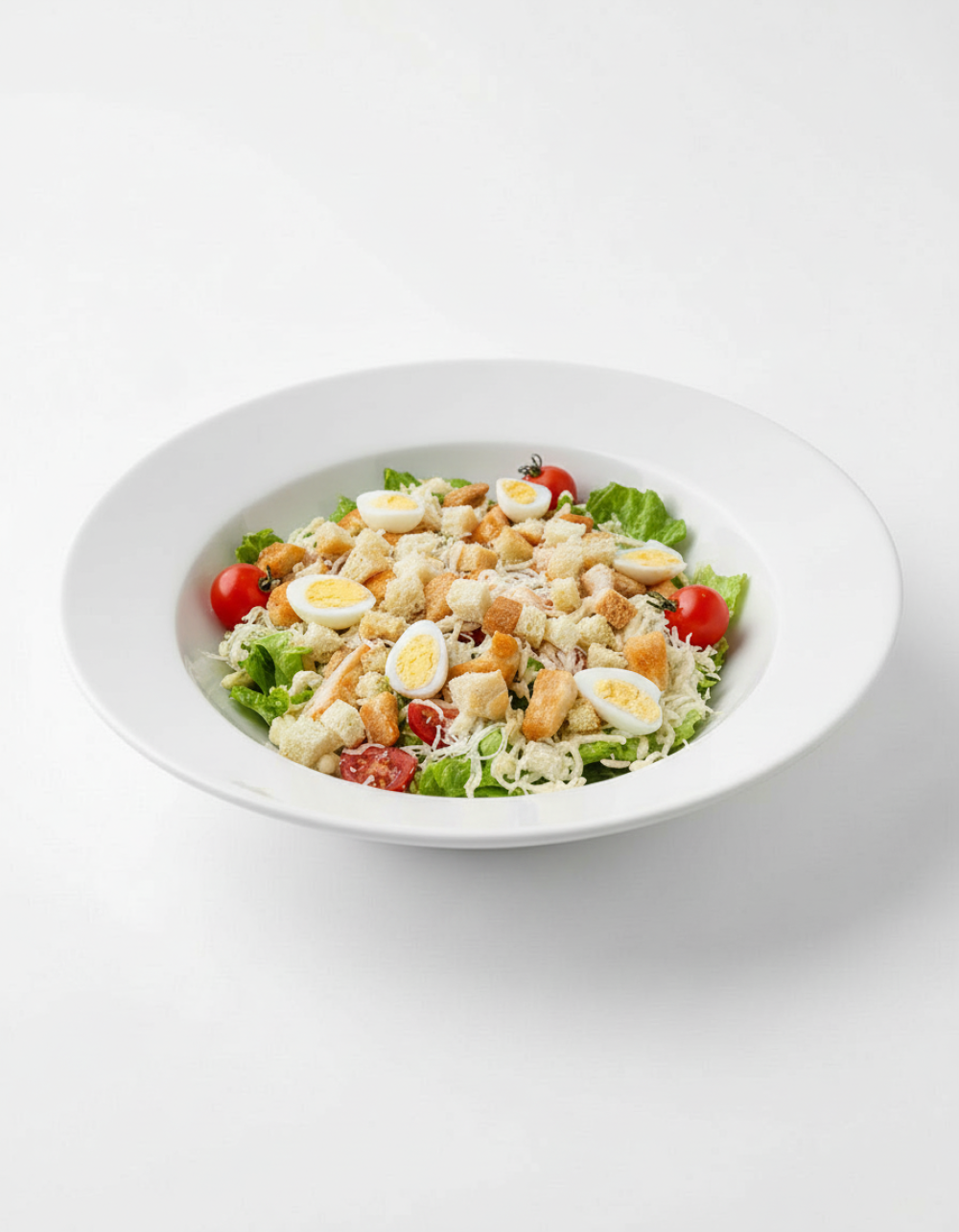 Куриное филе, яйцо перепелиное, помидор черри, лист салата, сухарики, соус цезарь, пармезан