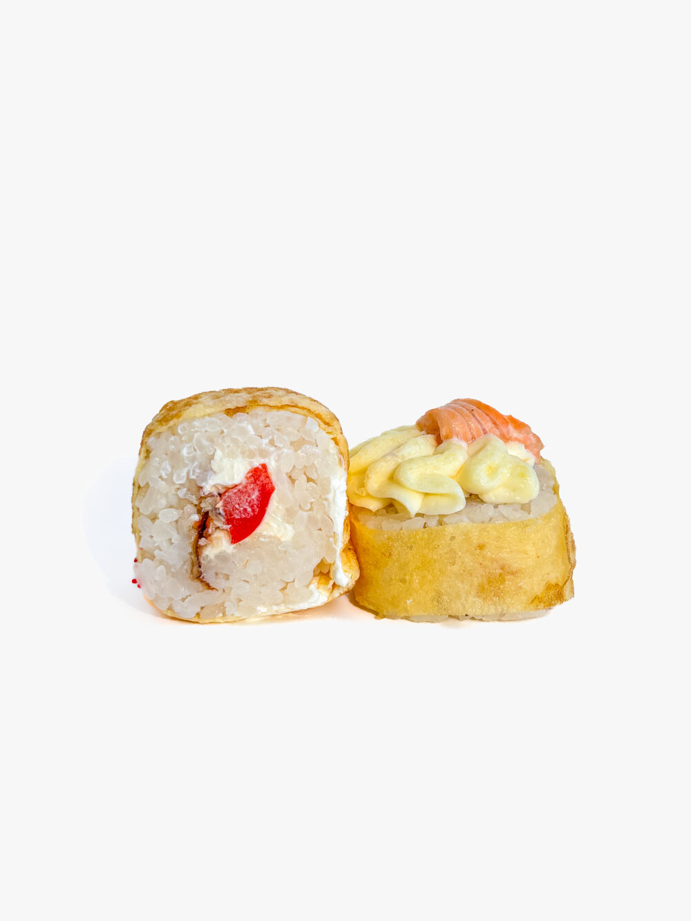 Угорь, болгарский перец, омлетный блин, сыр, сливочно-сырный соус с лососем