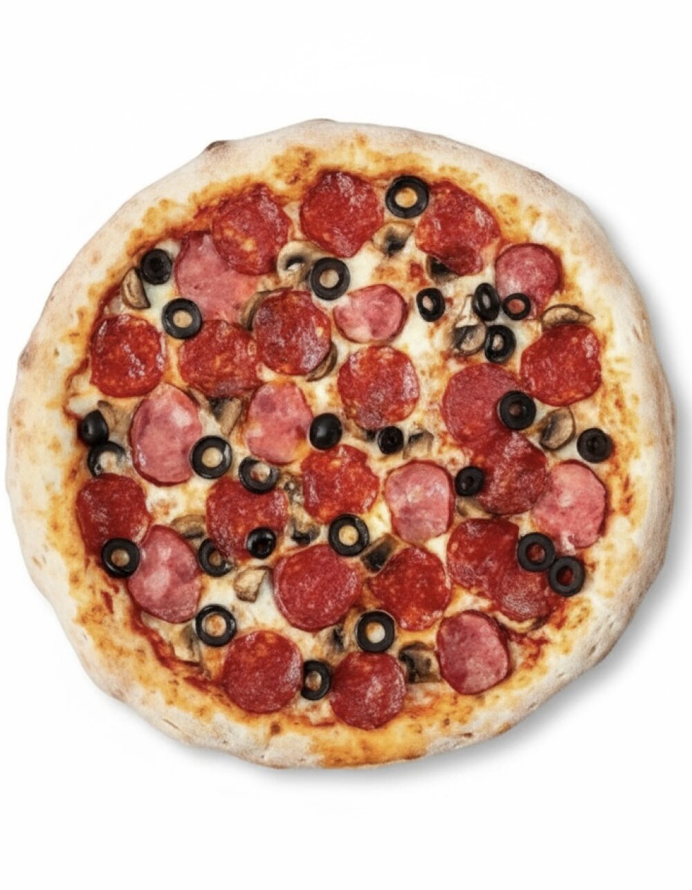 Краковская колбаса, пеперони, шампиньоны, маслины, моцарелла, томатный соус