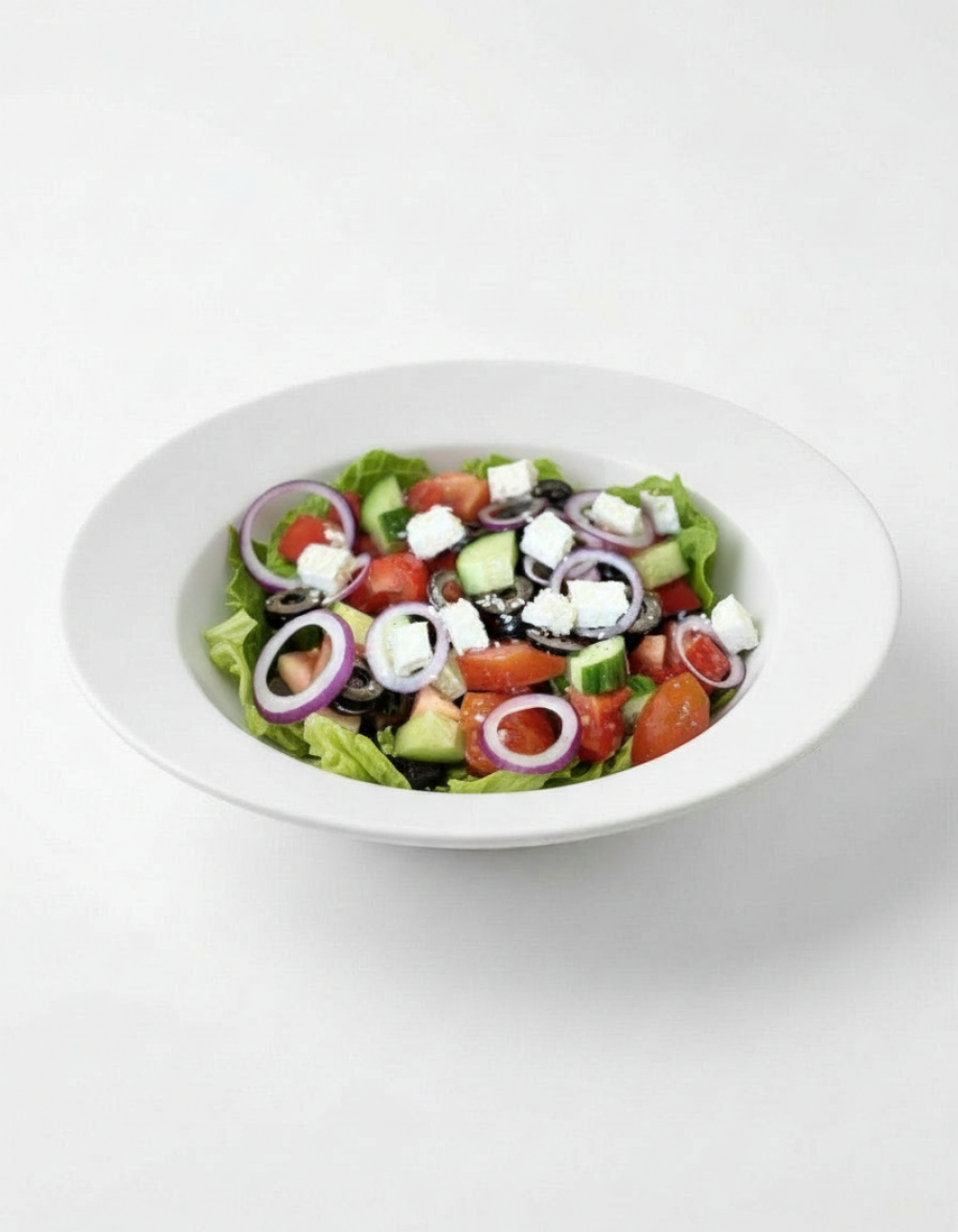 Огурец, помидор, перец, лист салата, сыр фета, маслины, лук фиолетовый