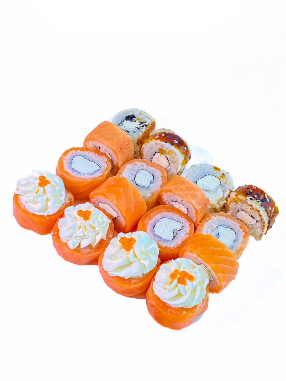 2 ролла: «Классическая филадельфия» 4 шт., «Филадельфия люкс» 4 шт., «Филадельфия» 4 шт., ролл «Филадельфия унаги» 4 шт., соевый соус 2 шт., имбирь 2 шт., васаби 1 шт., палочки 2 шт.