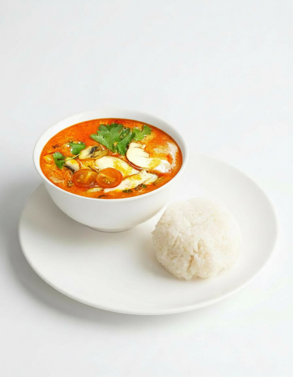 Куриное филе, помидоры черри, шампиньоны, кокосовое молоко, сливки, лимон. Подаётся с порцией пропаренного риса