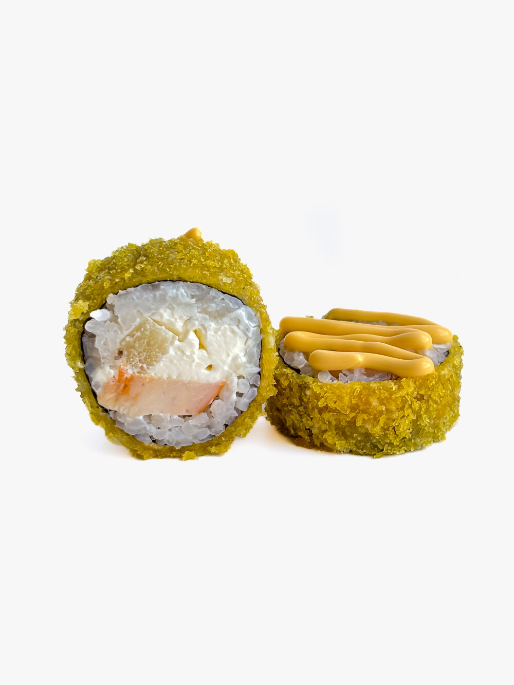 Ролл темпура с копчёной курочкой, ананасом и сливочным сыром. Украшен соусом Чеддер.