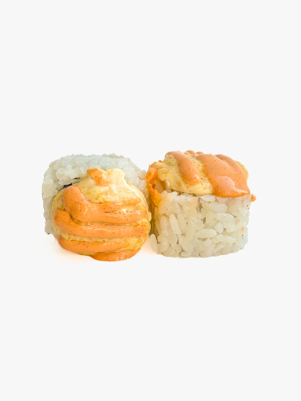 Запеченный ролл с беконом, огурцом и сливочным сыром. Украшен унаги кремом и спайси соусом.
