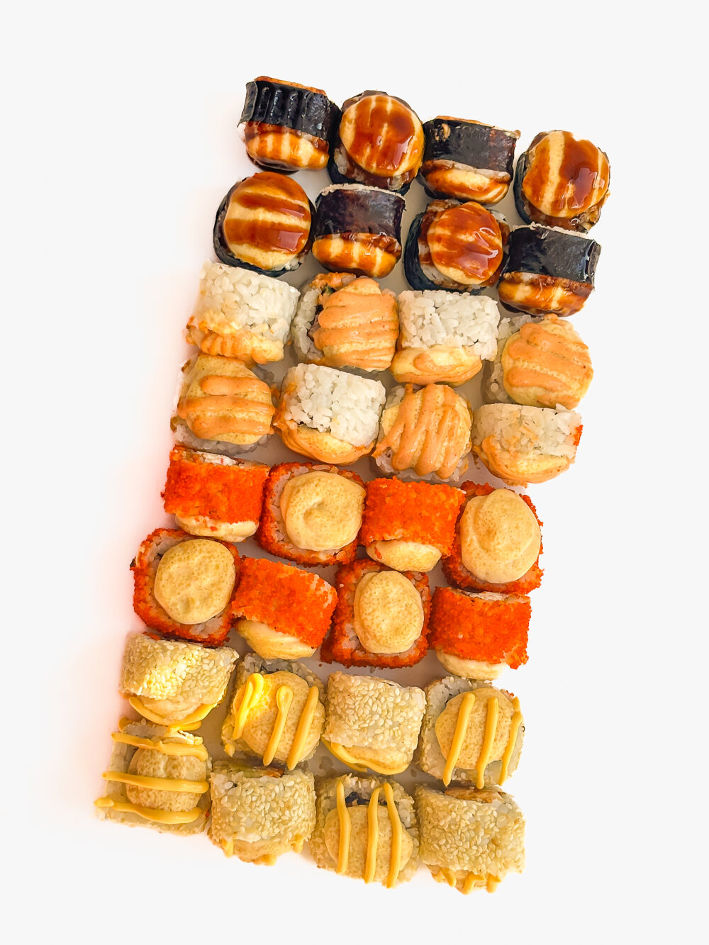 4 ролла: «Юки хот», «Бико хот», «Бостон хот», «Канадский хот», соевый 2 шт, имбирь 1 шт, васаби 1 шт, палочки 2 шт.